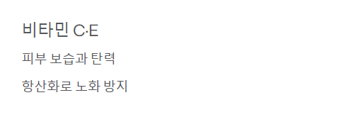 | 비타민 E | 항산화 작용 | 피부 노화 방지, 면역력 강화 |