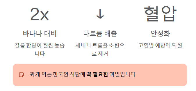 | 칼륨 | 나트륨 배출 | 고혈압 예방, 부종 완화 |