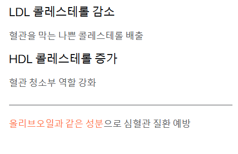 | 단일불포화지방산 | 혈중 지질 개선 | 고지혈증, 동맥경화 예방 |