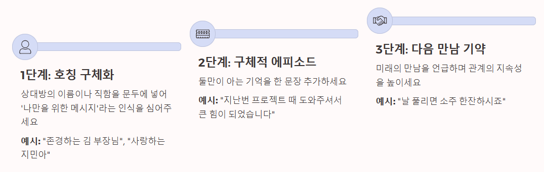 - 개인화 전략: 단체 문자보다는 상대방의 이름과 구체적인 에피소드를 한 줄이라도 포함하는 것이 핵심입니다.