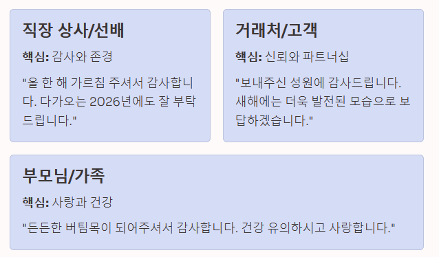 | 직장 상사/선배 | 존경, 감사, 지도편달 | "팀장님, 올 한 해 많은 가르침 주셔서 감사합니다. 덕분에 업무뿐만 아니라 많은 것을 배울 수 있었습니다. 남은 연말 따뜻하게 보내시고, 다가오는 2026년에도 잘 부탁드립니다." |