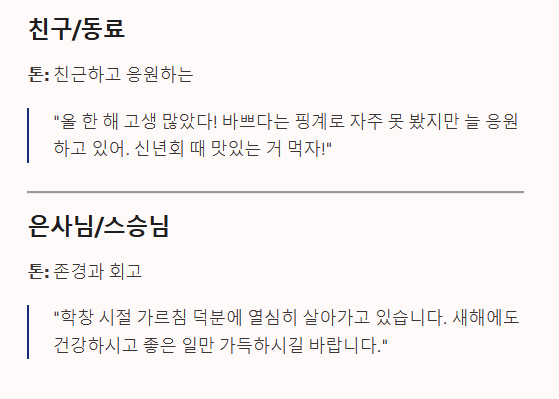 - 타이밍: 연말 인사는 12월 26일31일, 새해 인사는 1월 1일5일 사이가 가장 적절합니다.