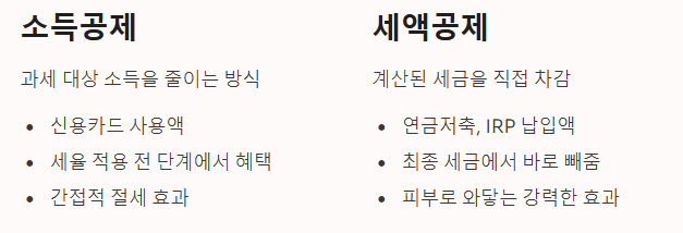 가장 먼저 이해해야 할 핵심은 연금저축이 세액공제 대상이라는 점입니다. 신용카드 사용액은 소득공제로서 과세 대상 소득 규모를 줄여주는 역할을 하지만, 연금저축 납입액은 이미 계산된 세금 고지서에서 금액을 직접 빼주는 방식입니다.
