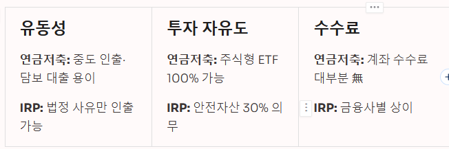- 투자 상품: IRP는 안전자산 30% 의무 보유 룰이 있어 공격적인 투자가 제한되지만, 연금저축은 주식형 ETF 등에 100% 투자가 가능합니다.