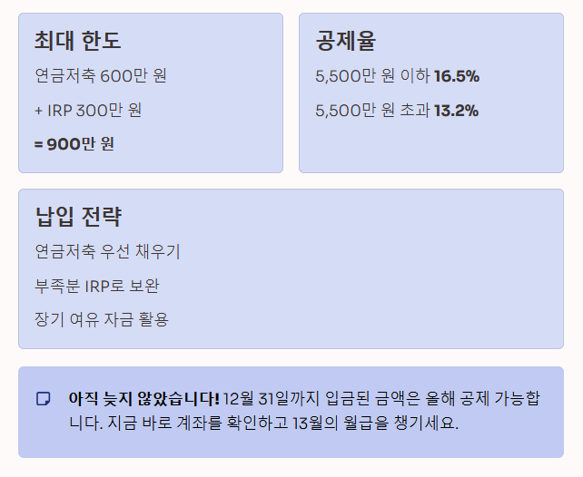 - 한도: 연금저축 600만 원 + IRP 합산 최대 900만 원
