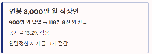 - 연봉 8,000만 원 직장인: 동일하게 900만 원을 납입하면 13.2%를 적용받아 약 118만 8천 원의 절세 효과가 발생합니다.