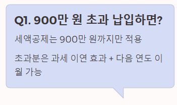 Q1. 공제 한도 900만 원을 넘게 넣으면 어떻게 되나요? 세액공제 혜택은 900만 원까지만 적용됩니다. 초과 납입한 금액은 세금 혜택은 없지만, 과세 이연 효과(운용 수익에 대한 세금을 나중에 내는 것)는 누릴 수 있습니다. 또한 초과분은 다음 연도로 이월하여 공제 신청할 수도 있습니다.