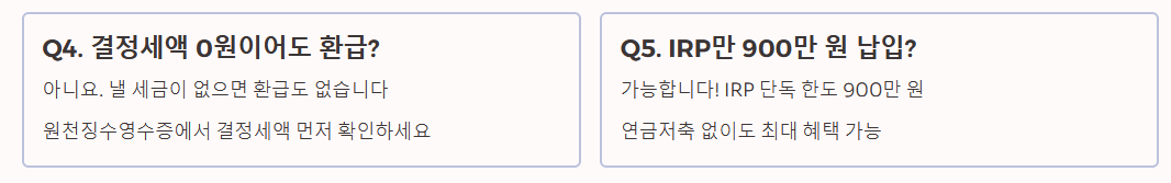 Q5. IRP만 900만 원 넣어도 되나요? 네, 가능합니다. IRP 단독 한도가 연 900만 원이므로, 연금저축 계좌 없이 IRP에만 900만 원을 넣어도 최대 공제 혜택을 모두 받을 수 있습니다.