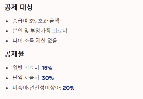 - 공제율: 초과 사용분에 대해 15% (난임시술비는 30%, 미숙아·선천성이상아는 20%)