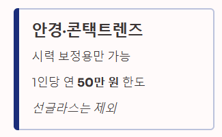 - 시력 보정용 안경·콘택트렌즈: 1인당 연 50만 원 한도 (선글라스 불가)