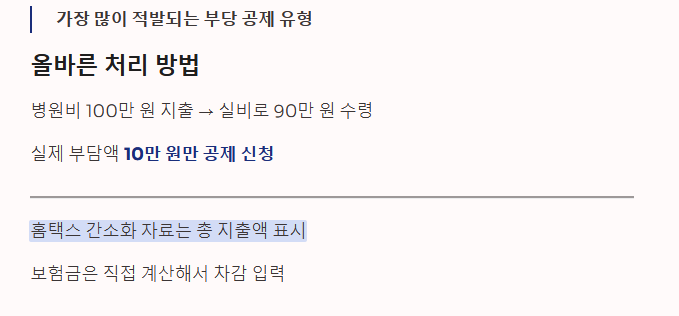 - 실손보험금 수령액: 보험사로부터 돌려받은 실비 금액은 반드시 차감해야 함