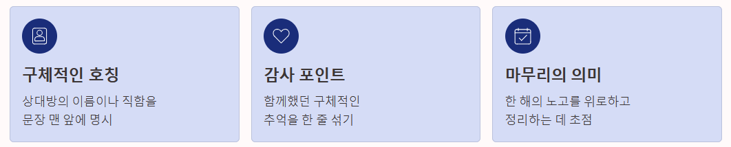 - 마무리의 의미: 새해 복을 비는 것도 좋지만, 연말 인사는 '지난 한 해의 노고를 위로하고 정리하는 것'에 초점을 맞추는 것이 좋습니다.