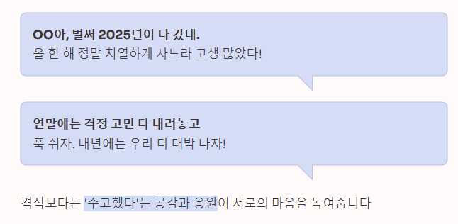 - "OO아, 벌써 2025년이 다 갔네. 올 한 해 정말 치열하게 사느라 고생 많았다! 연말에는 걱정 고민 다 내려놓고 푹 쉬자. 내년에는 우리 더 대박 나자!"