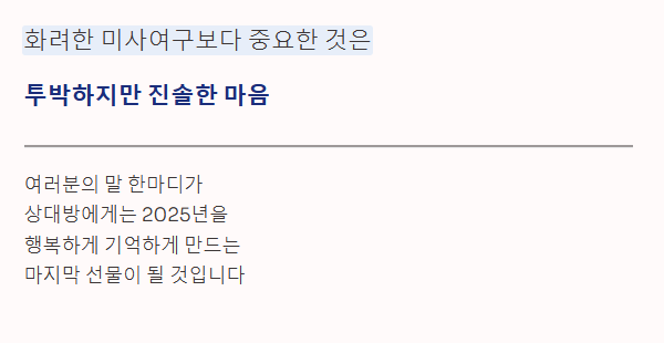 연말 인사는 2025년이라는 시간의 매듭을 짓는 중요한 과정입니다. 화려한 미사여구보다 중요한 것은 상대를 생각하는 투박하지만 진솔한 마음입니다.