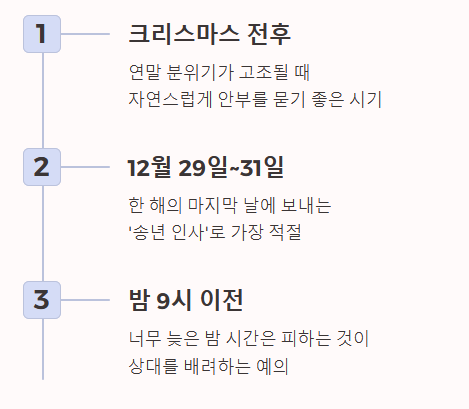 - 크리스마스 전후: 연말 분위기가 고조될 때라 자연스럽게 안부를 묻기 좋습니다.