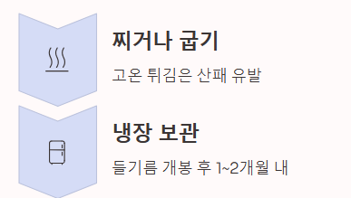 - 들기름은 무침용으로: 발연점이 낮아 볶음 요리에 쓰면 발암물질이 나올 수 있습니다. 나물 무침이나 비빔밥에 마지막에 뿌려 드세요.