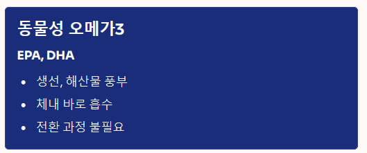 - 오메가3는 동물성(DHA/EPA)과 식물성(ALA)으로 나뉘며 두 가지를 골고루 섭취하는 것이 좋습니다.