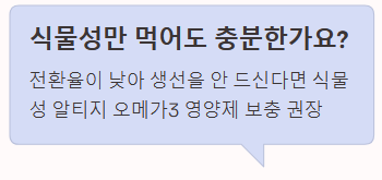 - 식물성(ALA)은 체내에서 EPA와 DHA로 전환되는 비율이 5~10% 정도로 낮습니다. 따라서 생선을 전혀 드시지 않는다면 미세조류에서 추출한 식물성 알티지 오메가3 영양제를 보충하는 것이 좋습니다.