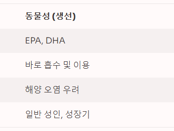 | 단점 | 해양 오염(중금속) 우려, 생선 비린내 | 체내에서 EPA/DHA로 전환되는 비율이 낮음 |