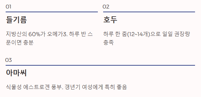 - 식물성 급원으로는 들기름, 호두, 아마씨가 탁월합니다.