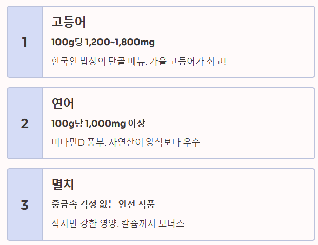 한국인 밥상에 가장 자주 올라오는 고등어는 오메가3의 보고입니다. 고등어 100g(약 반 마리)에는 오메가3가 약 1,200~1,800mg 함유되어 있습니다. 이는 하루 권장 섭취량을 충분히 채울 수 있는 양입니다. 특히 가을 고등어는 지방 함량이 높아 더욱 좋습니다.