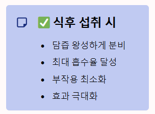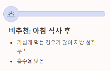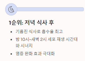 - 최적의 시간: 기름진 식사를 마친 직후 (점심 또는 저녁)
