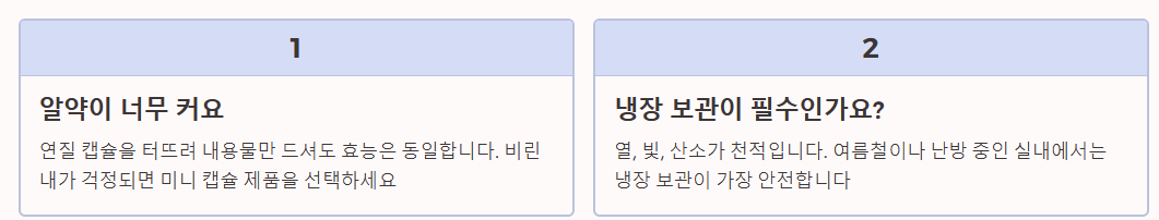 Q1. 알약이 너무 커서 삼키기 힘들어요. 씹어 먹어도 되나요? 연질 캡슐을 터뜨려서 내용물만 드셔도 효능에는 문제가 없습니다. 다만, 특유의 생선 비린내 때문에 비위가 약하신 분들은 힘들 수 있습니다. 최근에는 알 크기를 줄인 미니 캡슐 제품도 나오니 고려해 보세요.