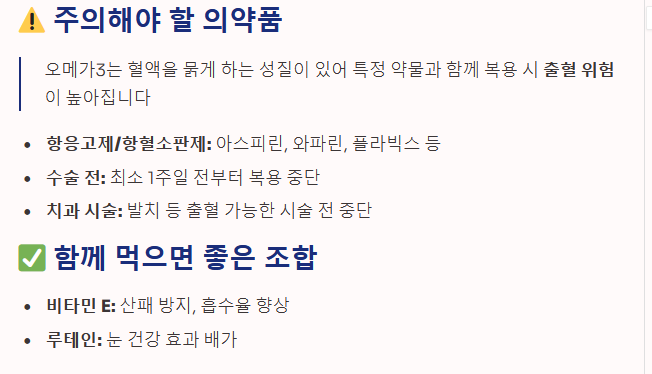 - 항응고제/항혈소판제: 아스피린, 와파린, 플라빅스 등 혈액 응고를 막는 약을 복용 중이라면 오메가3와 상충 작용을 일으켜 지혈이 안 될 수 있습니다. 반드시 의사와 상담해야 합니다.