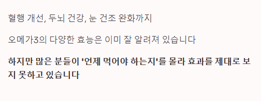 - 이유 2: 오메가3는 세포 재생과 염증 완화 효과가 있는데, 우리 몸의 재생은 주로 밤 10시~새벽 2시 사이에 활발히 일어납니다. 저녁에 섭취하면 이 리듬에 맞춰 시너지 효과를 낼 수 있습니다.