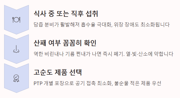 - 순도와 포장 상태 체크 불순물이 적은 고순도 제품을 선택하고, 공기 접촉을 최소화할 수 있는 PTP(개별 포장) 제품을 고르는 것이 산패 예방에 좋습니다.