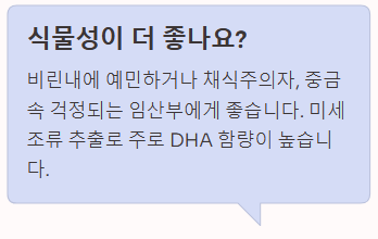 - 비린내에 예민하거나 채식주의자, 중금속 오염이 걱정되는 임산부라면 미세조류에서 추출한 식물성 오메가3가 좋습니다. 식물성은 주로 DHA 함량이 높습니다.