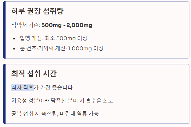- 하루 권장 섭취량: 식약처 기준 성인 하루 500mg ~ 2,000mg(EPA와 DHA의 합)입니다. 혈행 개선을 원한다면 최소 500mg 이상, 눈 건조나 기억력 개선까지 기대한다면 1,000mg 이상 고함량 제품을 드시는 것이 좋습니다.