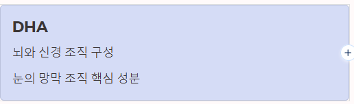 - DHA: 뇌와 신경 조직, 눈의 망막 조직을 구성하는 주요 성분입니다.