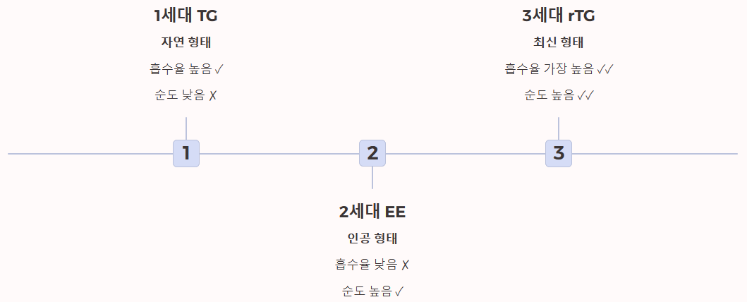 | 3세대 (rTG) | 최신 형태 | 불순물을 줄이고 자연 분자 구조로 복원하여 흡수율과 순도 모두 높음 | 가장 높음 | 높음 |
