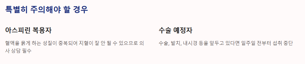 - 수술이나 발치, 내시경 등을 앞두고 있다면 출혈 위험을 줄이기 위해 최소 일주일 전부터 섭취를 중단하는 것이 원칙입니다.