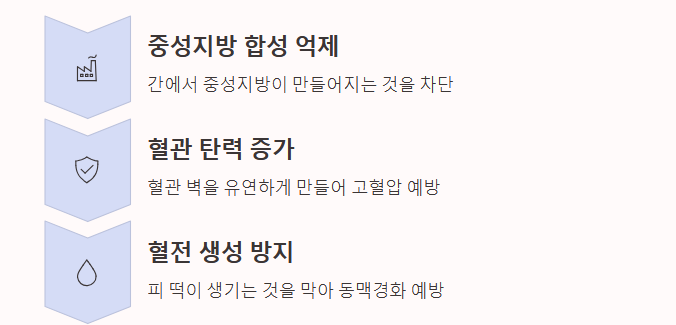 가장 잘 알려진 효능입니다. 간에서 중성지방이 합성되는 것을 억제하여 혈중 중성지방 농도를 낮춥니다. 또한 혈관 벽을 탄력 있게 만들고 혈전(피 떡) 생성을 막아 고혈압, 동맥경화, 심근경색 등 심혈관 질환 예방에 도움을 줍니다.