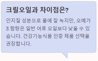 - 크릴오일은 인지질 성분이 있어 물에 잘 녹는 특징이 있지만, 오메가3 함량 자체는 일반 어류 오일보다 낮은 경우가 많습니다. 건강기능식품으로 인증받은 '오메가3' 제품을 드시는 것이 검증된 효능을 얻기에 유리합니다.