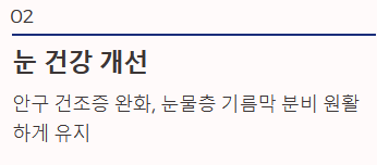 - 눈 건강: 안구 건조증을 개선하고 눈의 망막 조직을 구성하는 필수 성분입니다.