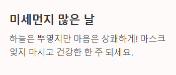 - 미세먼지가 많은 날: "하늘은 조금 뿌옇지만 마음만은 상쾌하게 시작하셨으면 좋겠습니다. 호흡기 건강 꼭 챙기시고 마스크 잊지 마세요! 건강한 한 주 되세요."