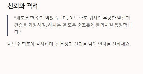 - "OOO 님, 새로운 한 주가 밝았습니다. 지난주 보내주신 관심과 협조에 늘 감사드립니다. 이번 주도 귀사의 무궁한 발전과 건승을 기원하며, 하시는 일 모두 순조롭게 풀리시길 응원합니다."