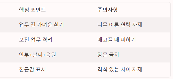 | 출근 직후 | 09:00 ~ 10:00 | 업무 시작 전 가벼운 환기 | 너무 이른 새벽 연락 자제 |