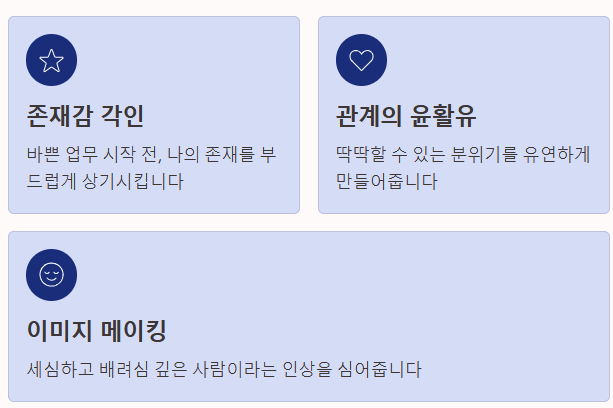 - 존재감 각인: 바쁜 업무가 시작되기 전, 나의 존재를 상대방에게 부드럽게 상기시킬 수 있습니다.