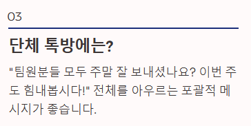| 점심 직전 | 11:30 ~ 12:00 | 오전 업무 격려 및 식사 인사 | 배고프고 예민할 때 피하기 |