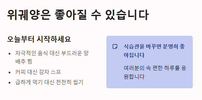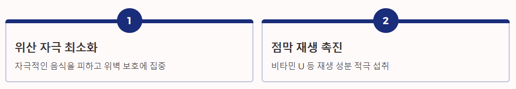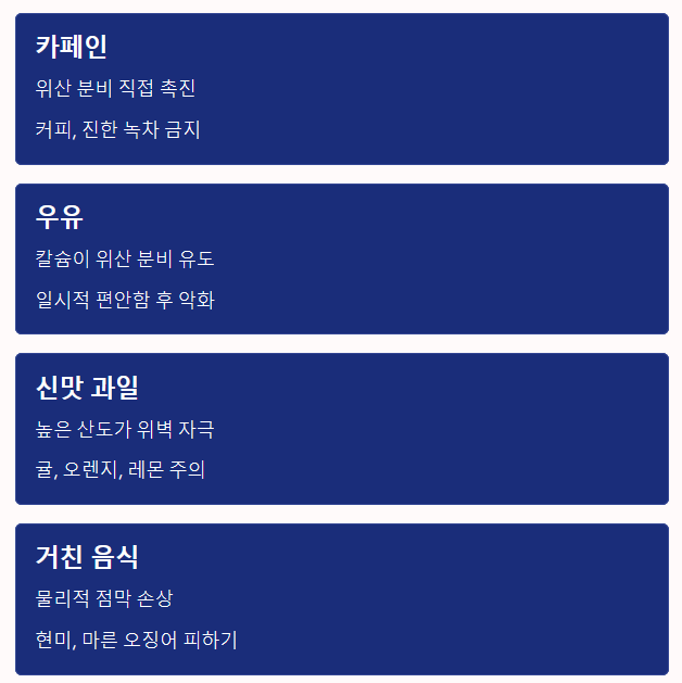 - 자극 차단: 위벽을 직접적으로 자극하는 카페인, 알코올, 캡사이신을 철저히 배제해야 합니다.