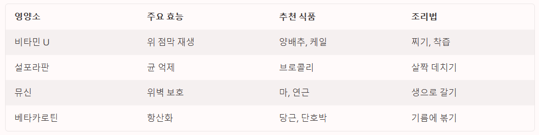 | 비타민 U | 위 점막 세포 재생, 염증 완화 | 양배추, 케일 | 살짝 찌거나 착즙 |