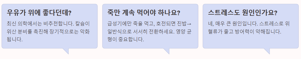 과거에는 우유를 권장하기도 했으나, 최신 의학 기준으로는 위궤양 환자에게 우유를 권하지 않습니다. 우유의 칼슘이 위산 분비를 촉진하기 때문입니다. 특히 잠들기 전 우유는 새벽 속 쓰림의 주범이 될 수 있습니다.