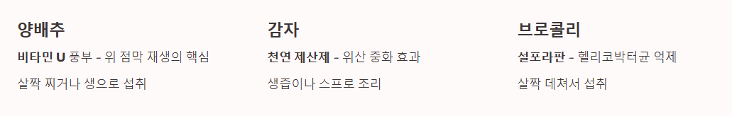 - 비타민 U 섭취: 위 점막의 재생을 돕는 핵심 성분인 비타민 U가 풍부한 채소를 섭취해야 합니다.