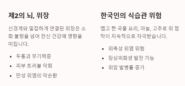 위장은 '제2의 뇌'라고 불릴 정도로 신경계와 밀접하게 연결되어 있습니다. 위 기능이 떨어지면 소화 불량뿐만 아니라 두통, 무기력증, 피부 트러블 등 전신 증상으로 이어질 수 있습니다.