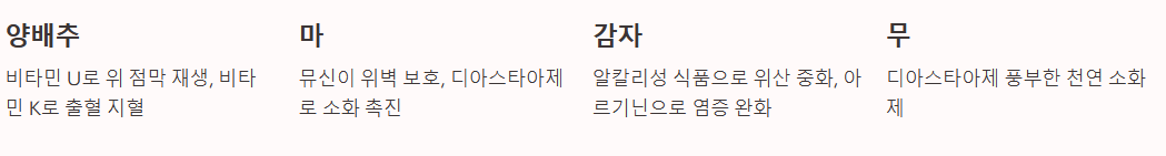 | 속 쓰림/위궤양 | 양배추, 감자 | 비타민 U, 아르기닌 | 점막 재생, 위산 중화 |