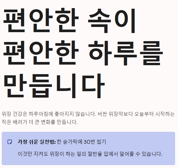 가장 쉬운 실천법은 한 숟가락에 30번 씹기입니다. 이것만 지켜도 위장이 하는 일의 절반을 입에서 덜어줄 수 있습니다. 편안한 속이 편안한 하루를 만듭니다. 오늘부터 내 위를 위한 작은 배려를 시작해 보시기 바랍니다.